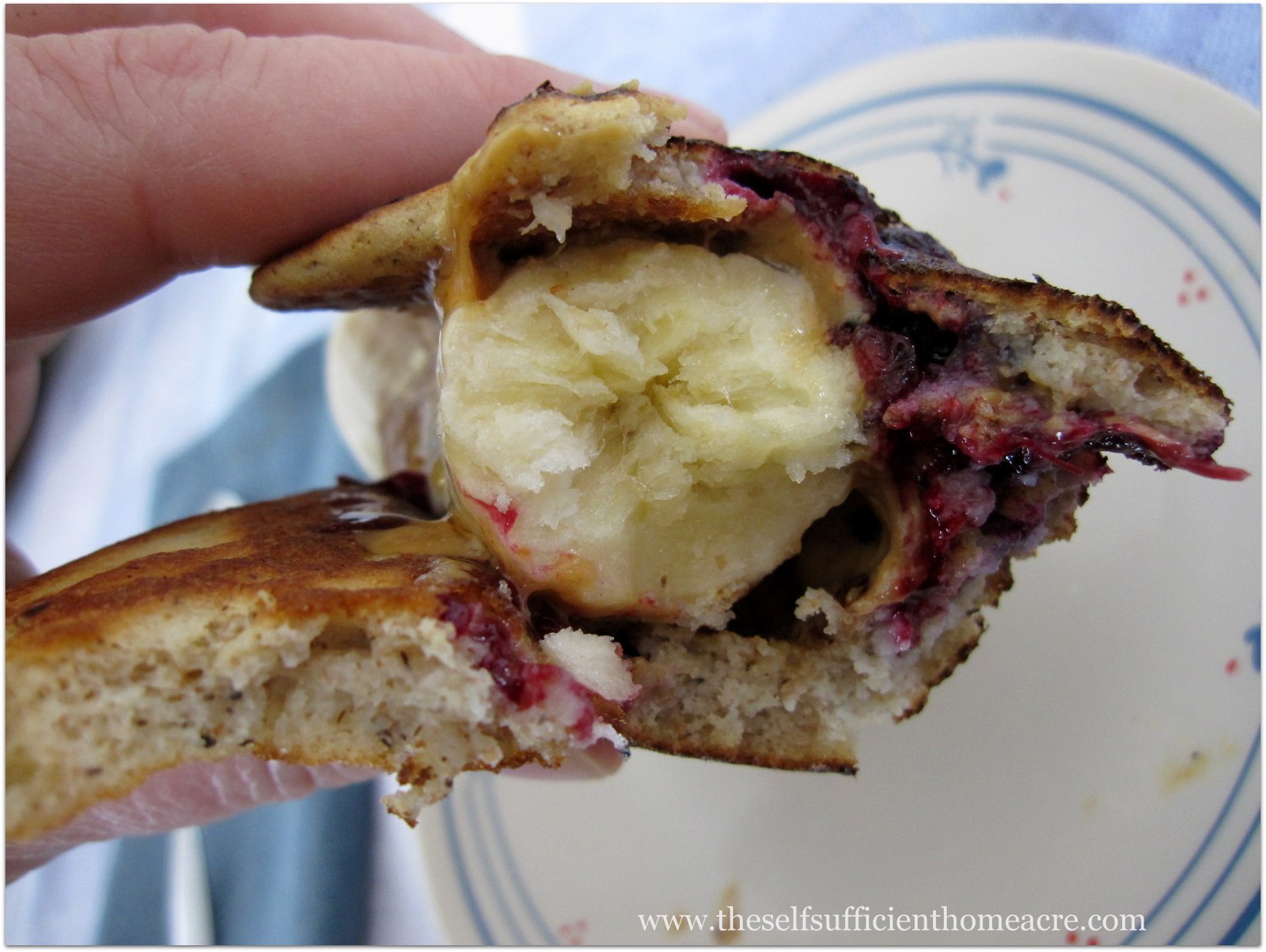 - Start with a pancake - we had a few leftover blueberry pancakes from breakfast waiting for us in the fridge.